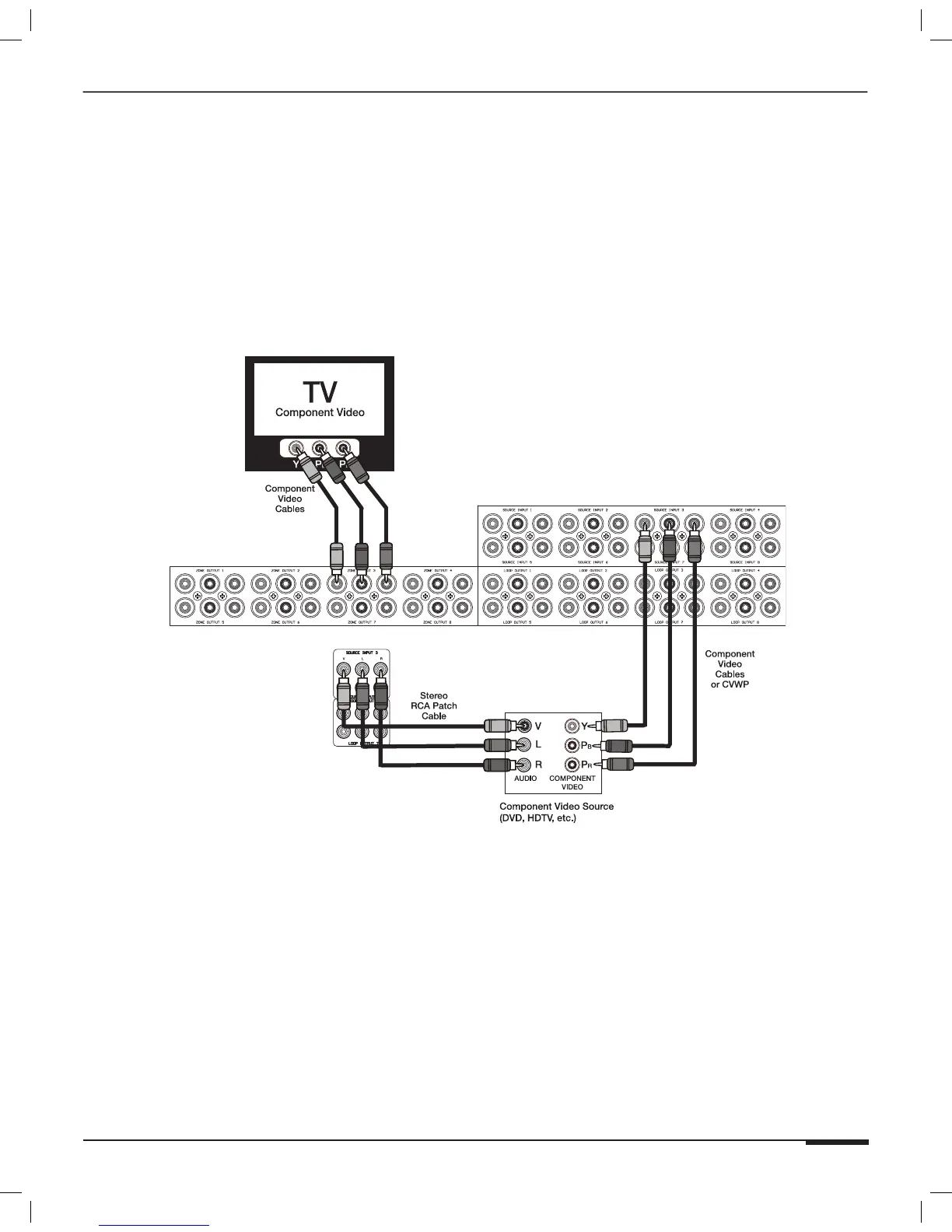 Use an ELAN V85 (or multiple V85s) to switch component video. Up to 8 sources can be switched to up to 32 loca-