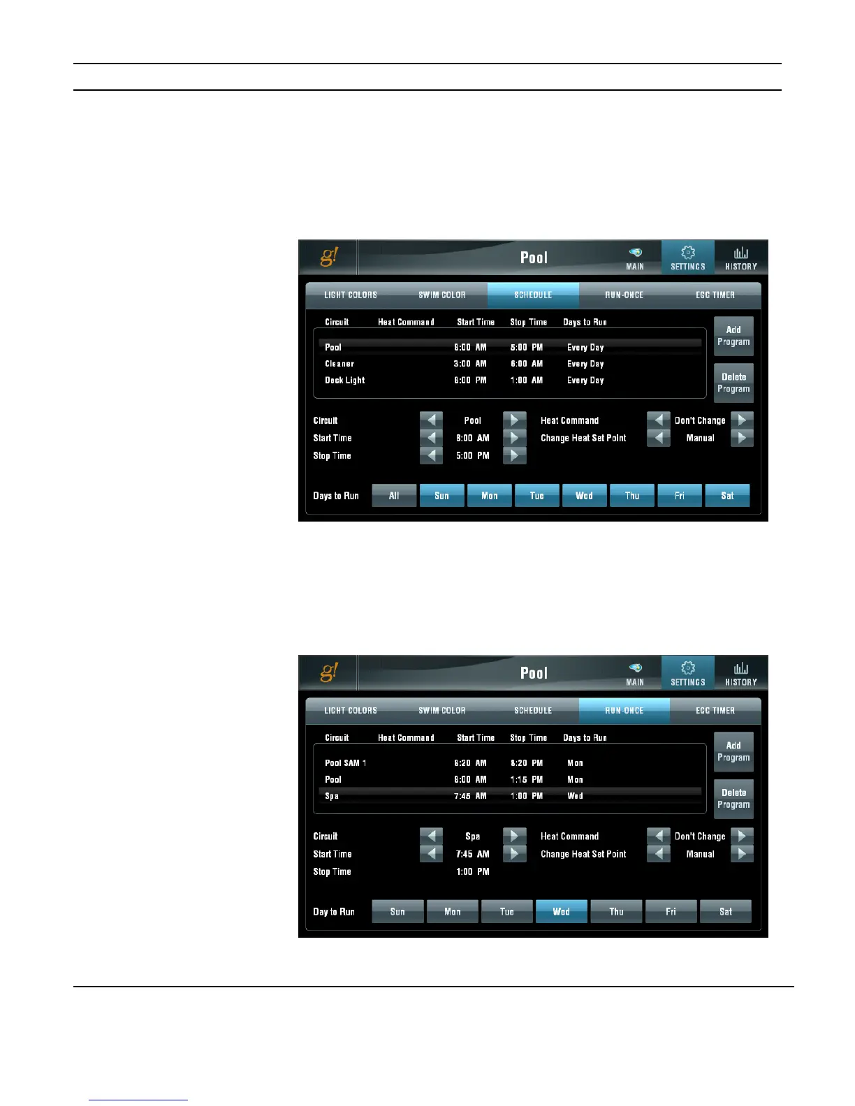 Use the SCHEDULE TAB to add scheduled “programs” for pool pumps, water features, and