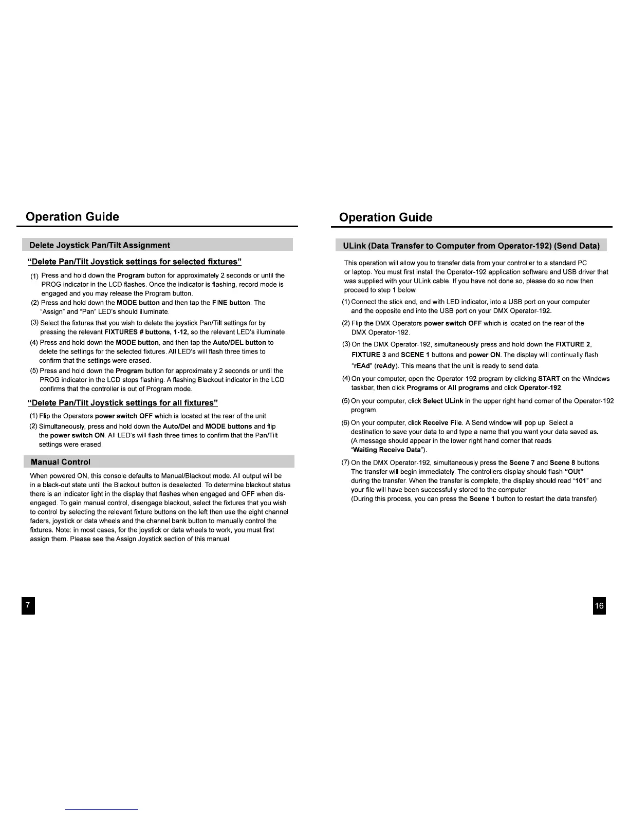 Elation DMX Operator 192 - Operation Guide: Joystick Assignment Deletion; Delete Joystick Settings for Selected Fixtures; Delete All Joystick Settings; Operation Guide: Manual Control and Data Transfer