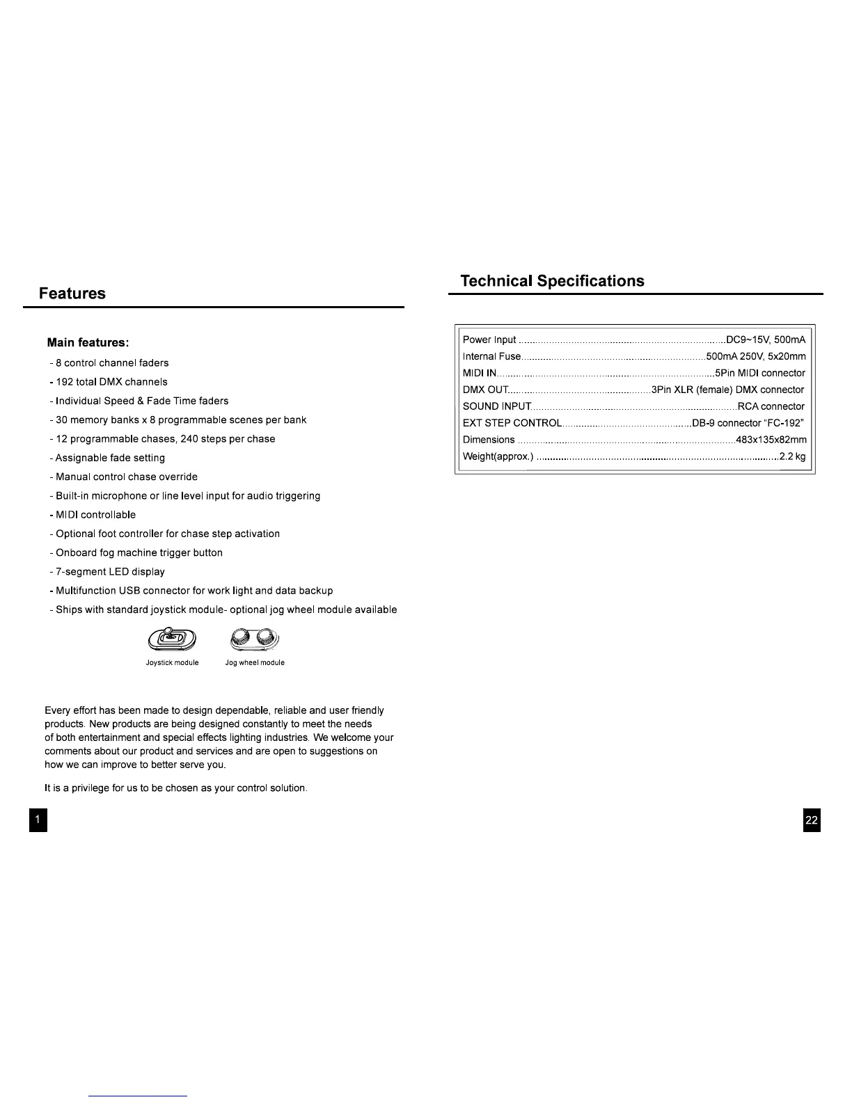 Elation DMX Operator 192 - Features Overview; Main Features List; Technical Specifications; Technical Specifications List
