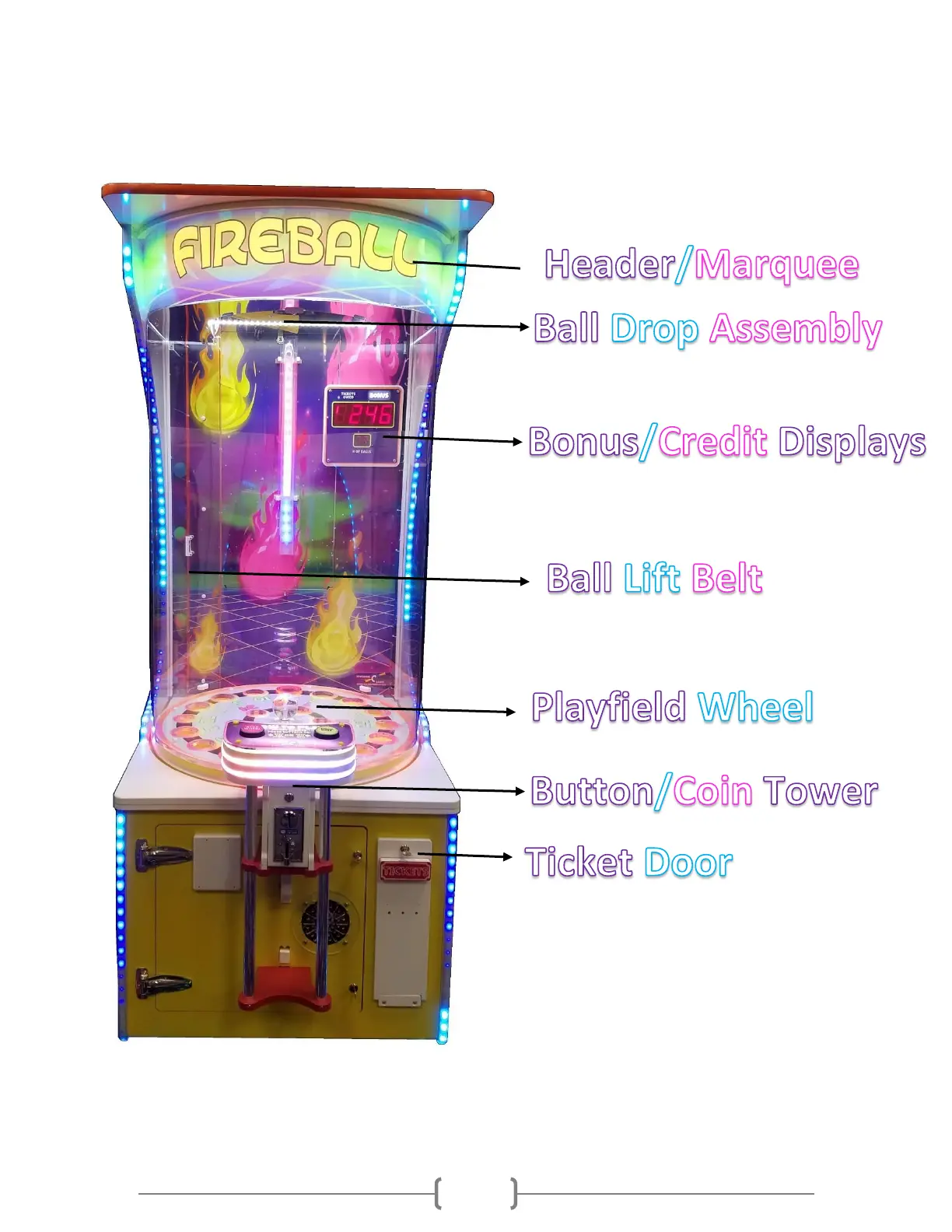 ELAUT Benchmark Games Fireball - Fireball Game Physical Components; Header;Marquee; Ball Drop Assembly; Bonus;Credit Displays