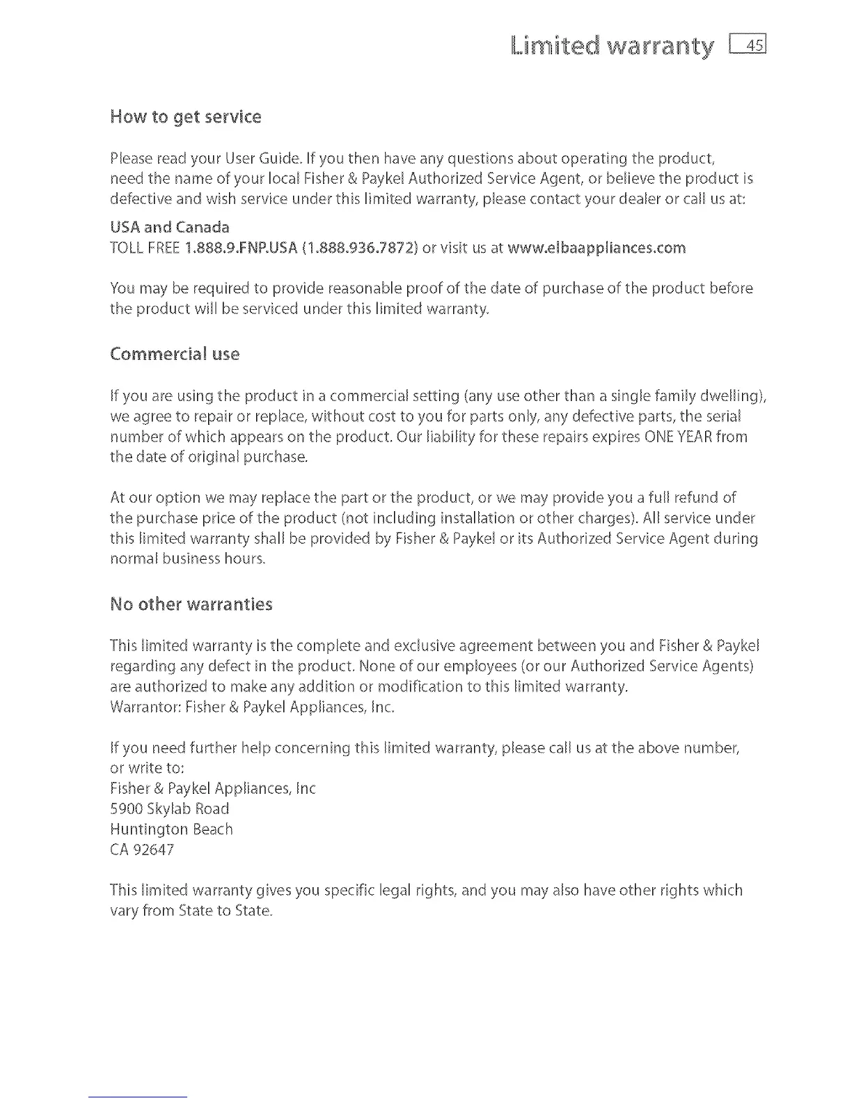 Warrantor: Fisher & Paykel Appliances, Inc.