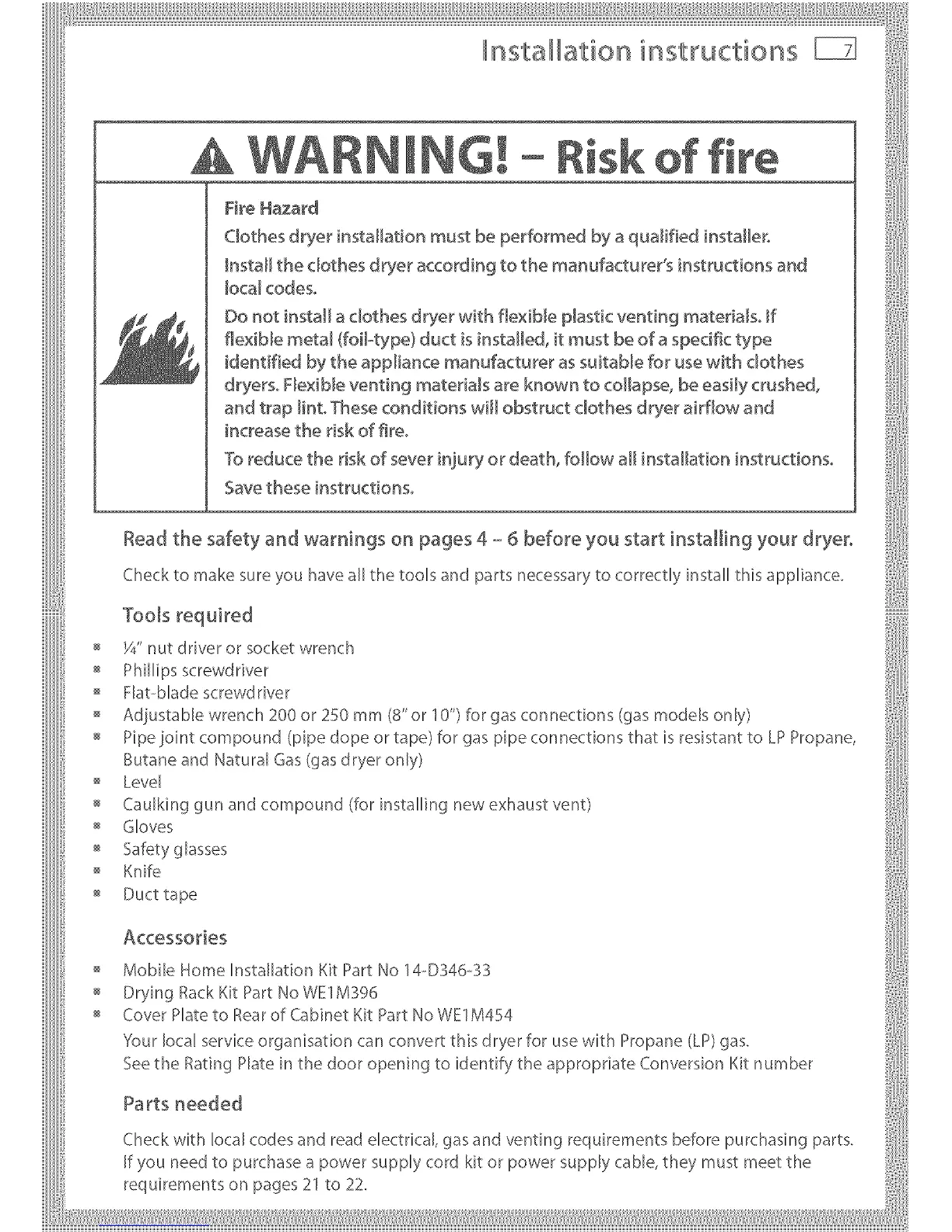 Readthe safety and warnings on pages 4 - 6 before you start installing your dryer.