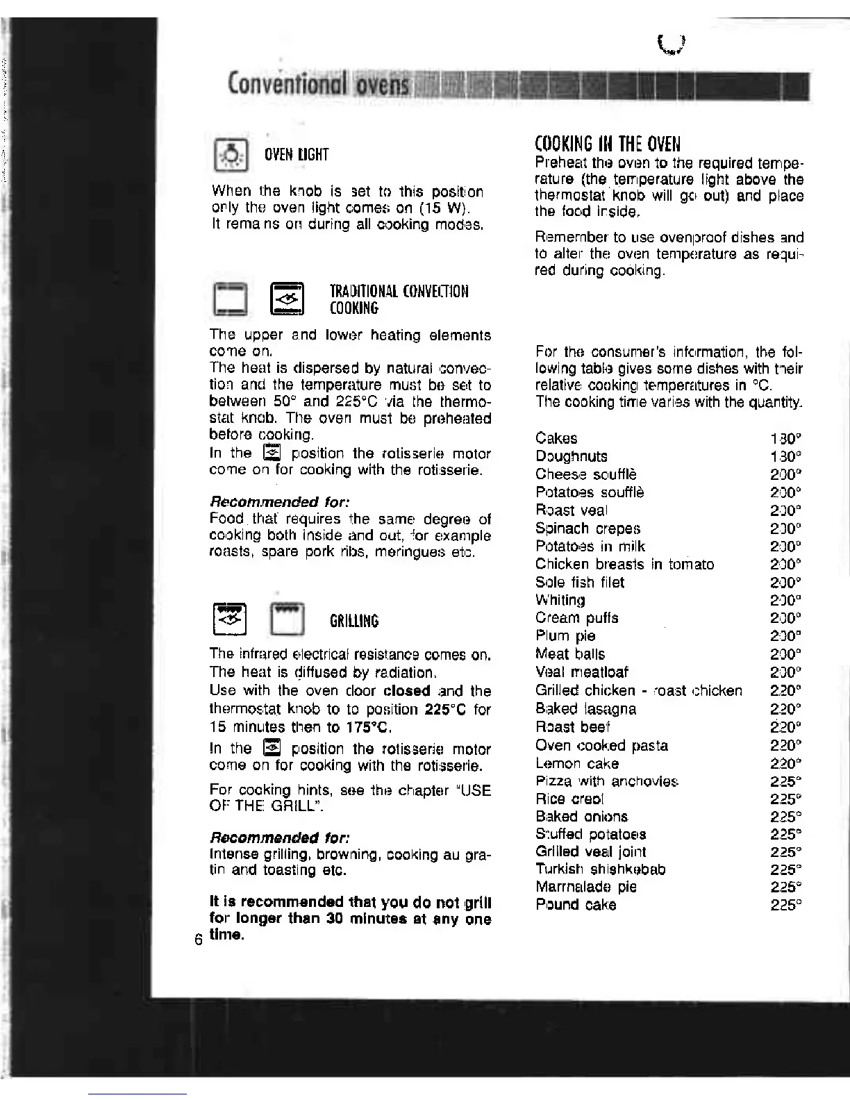 Elba EB 4820 - Conventional Ovens: Cooking Modes; Oven Light Function; Traditional Convection Cooking; Grilling Function