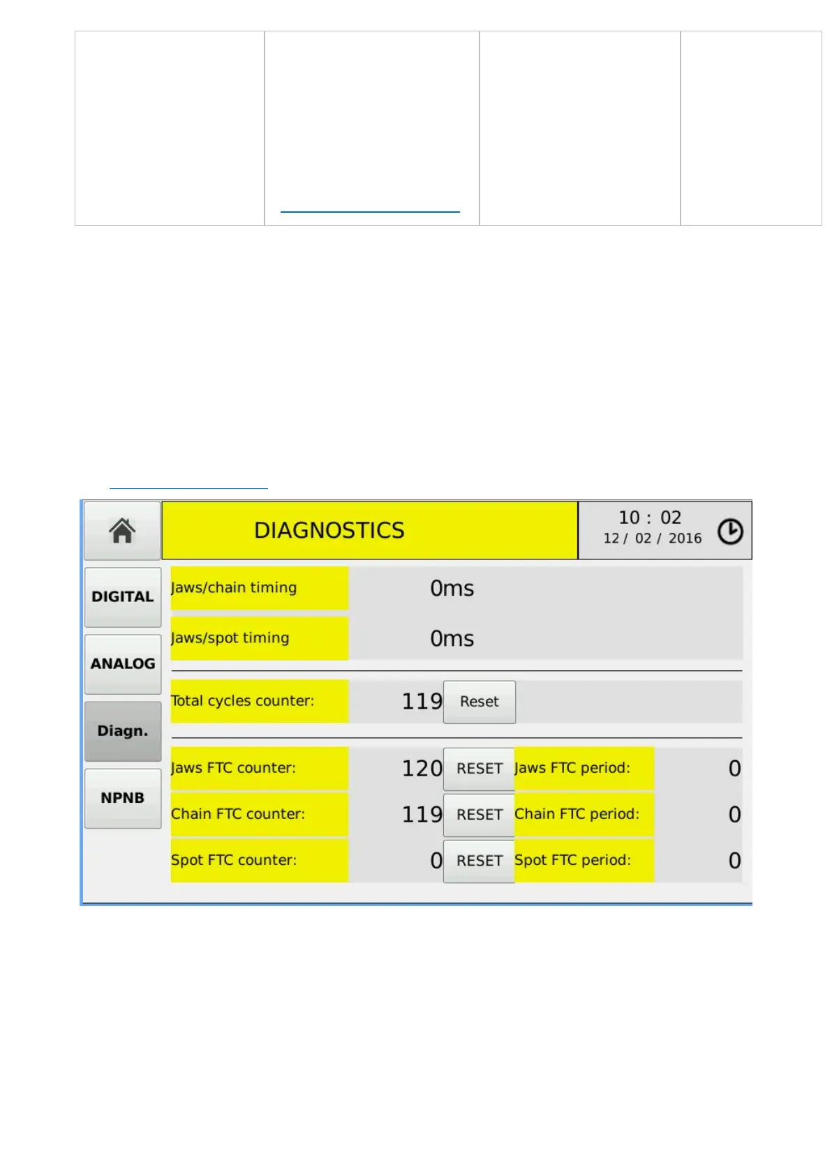 The diagnostic parameters "Time blades / chain" and "Time blades / notch" represent in