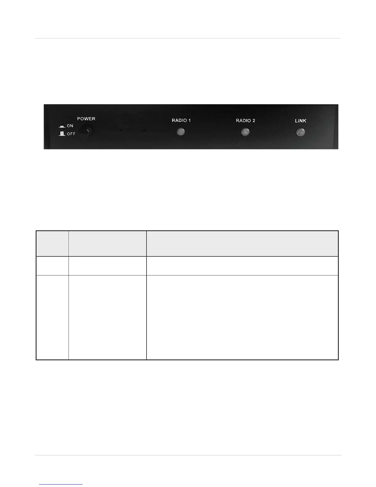 RADIO 1, RADIO 2, LINK: LED indicators, the functions of which are presented in table 2 below