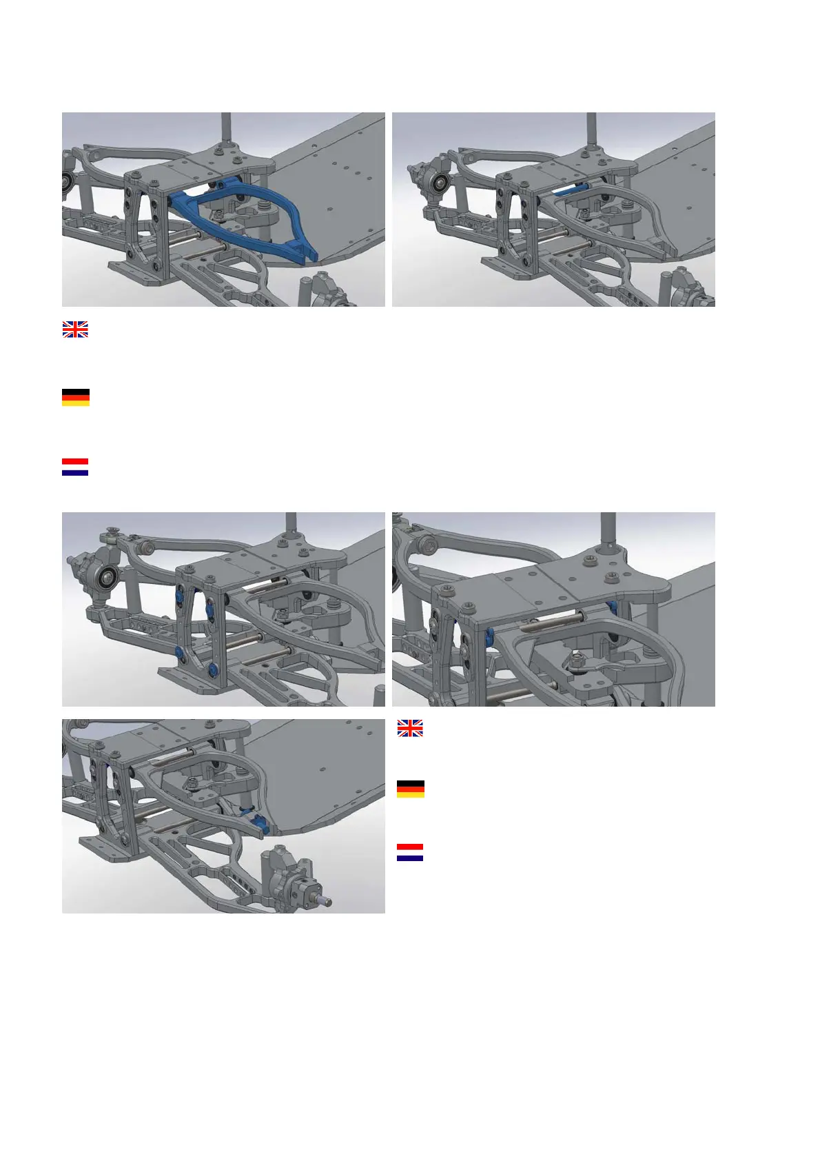 Vorderachsbock A. Stecken Sie je 2 blaue Nachlaufclipse vor die oberen Querlenker und je 1 dahinter.