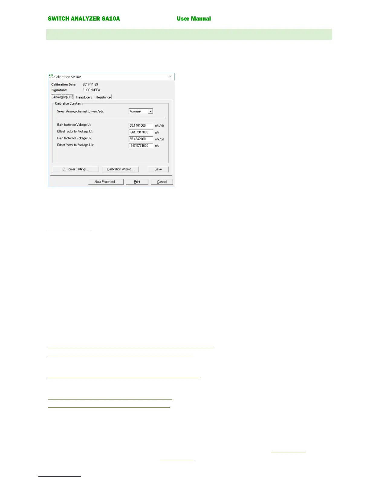 Print. Printout all calibration constants for SA10A on a connected printer.