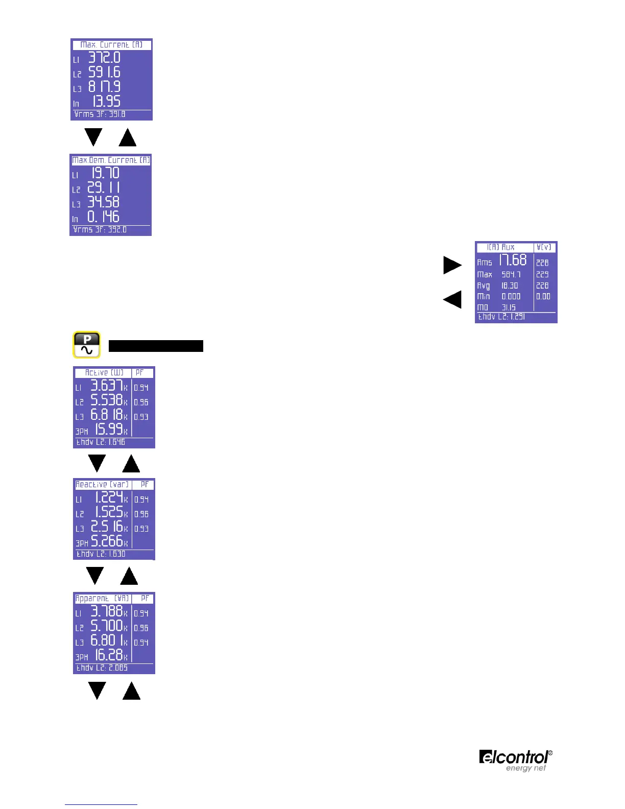 The first page of this menu displays the active power (W) in each phase and in the three-