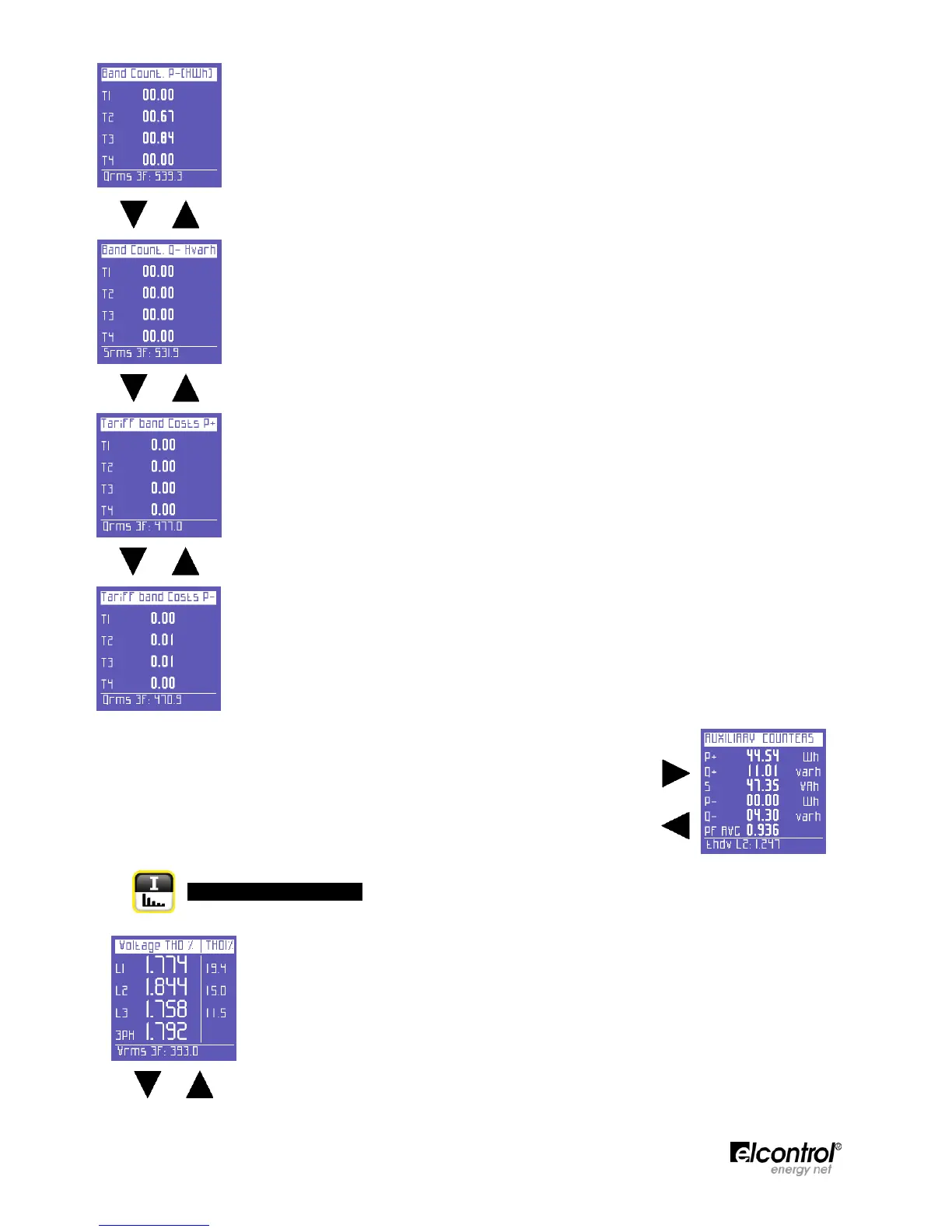 The first page of this menu displays the THD% (Total Harmonic Distortion) of the voltage