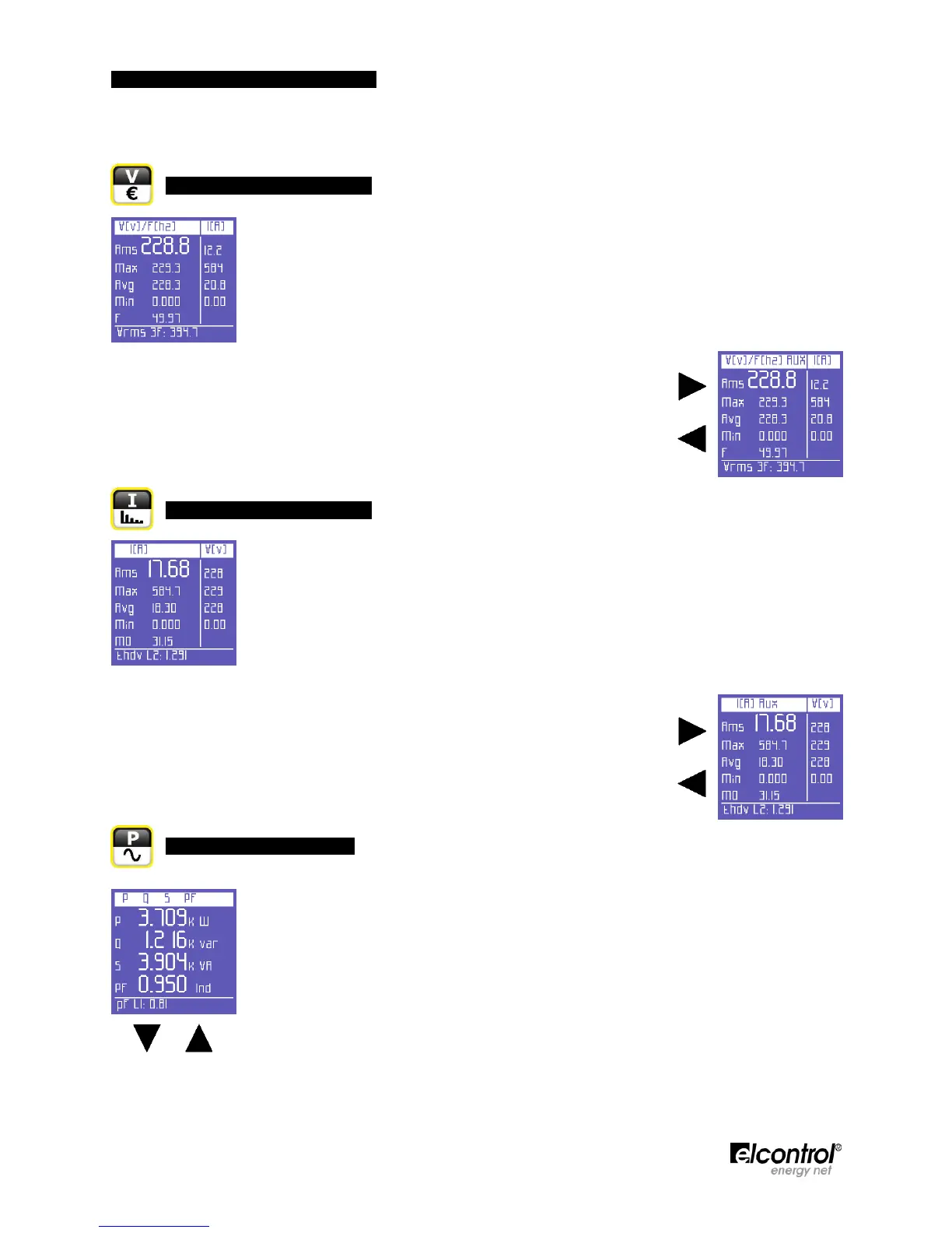 Menus (Currents, Power, Counters, Harmonics, Waveforms) by selecting them with