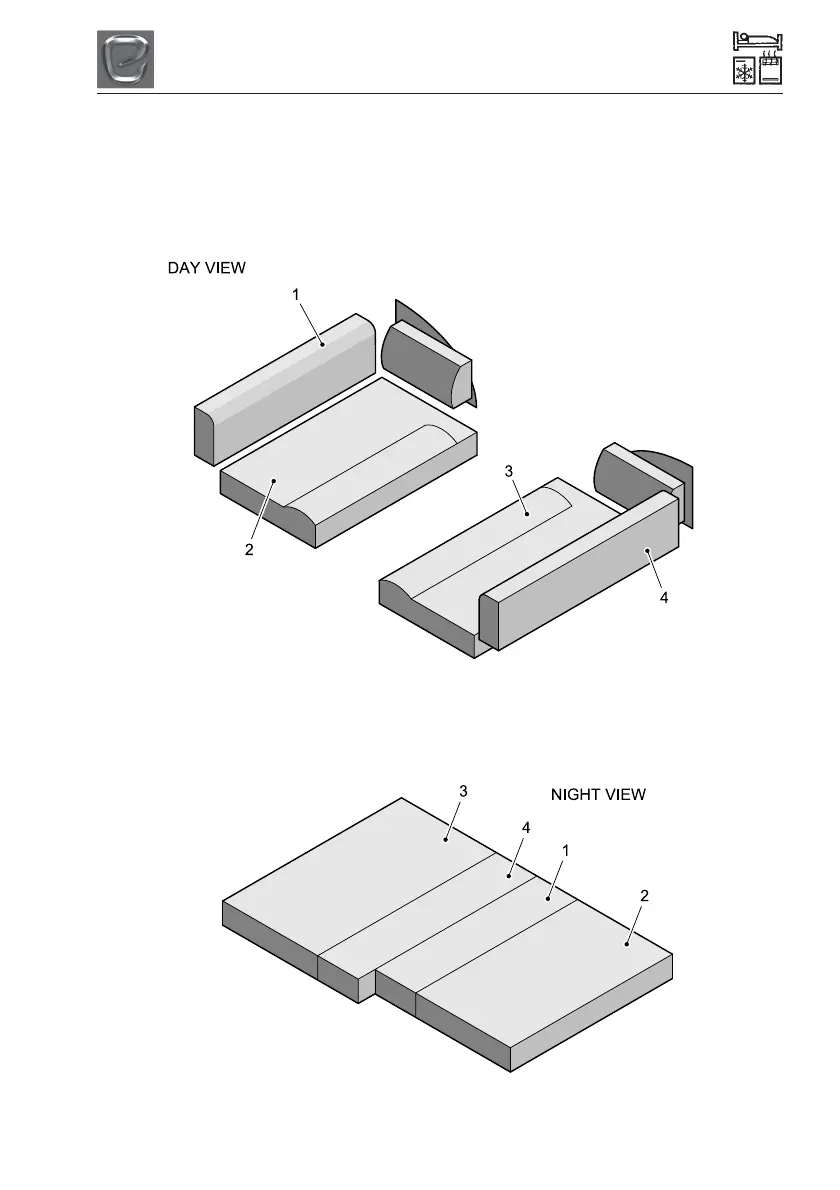 The front double bed in the 105 is made up by lifting the two side beds up and pulling them
