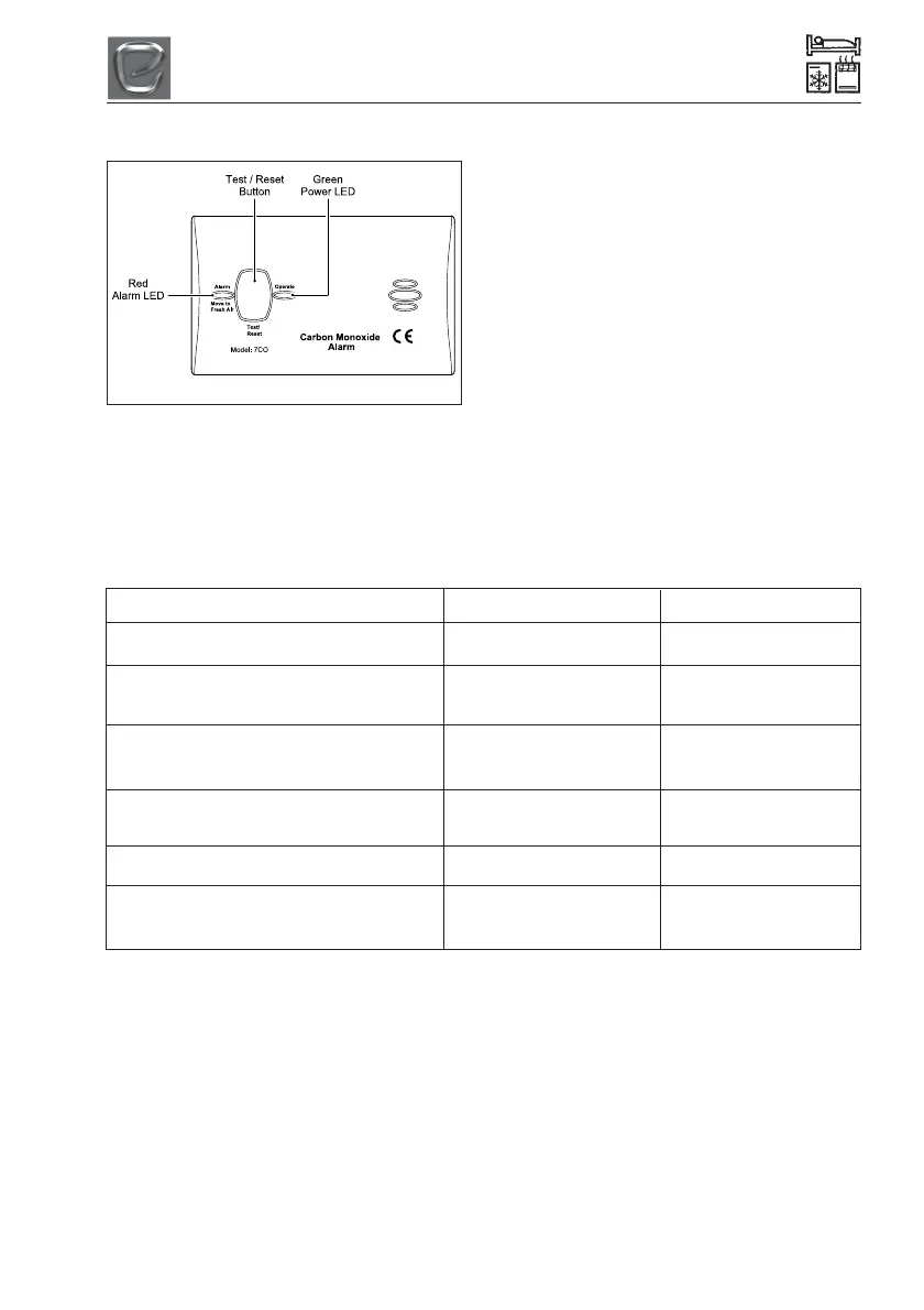 Loud continuous alarm with the red LED Dangerous levels of CO Follow emergency