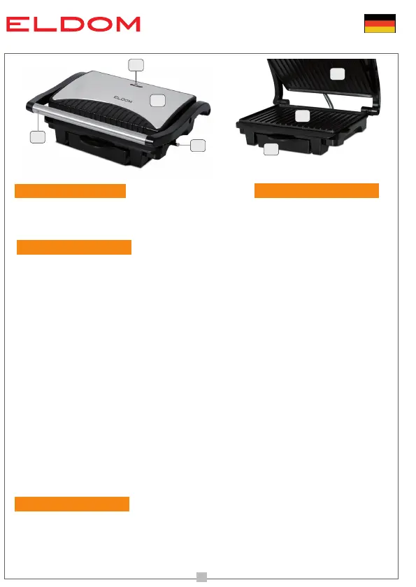 - Am Griff (4) fassen und den Deckel öffnen. Das Grillgut einlegen und den Deckel vorschichtig
