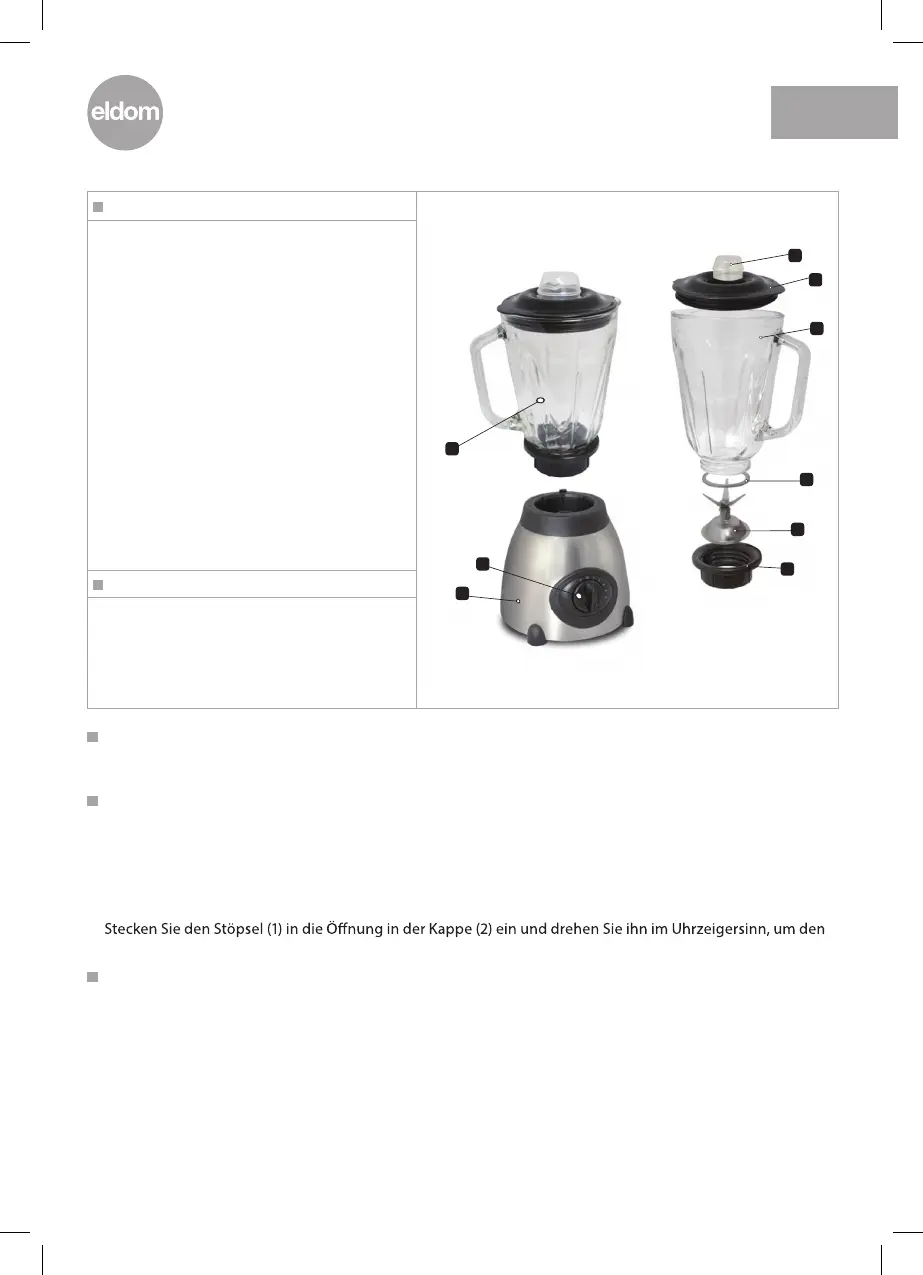• Ziehen Sie die Kappe (2) und den Stöpsel (1) an; (siehe: Montage des Glasbehälters)