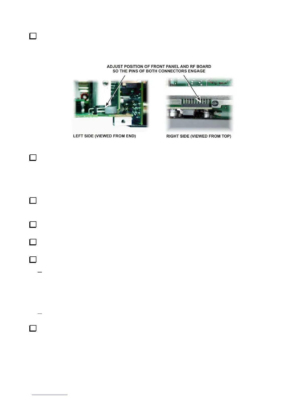 side of each multi-pin connector on the top of the RF board while holding the front panel to engage them. There