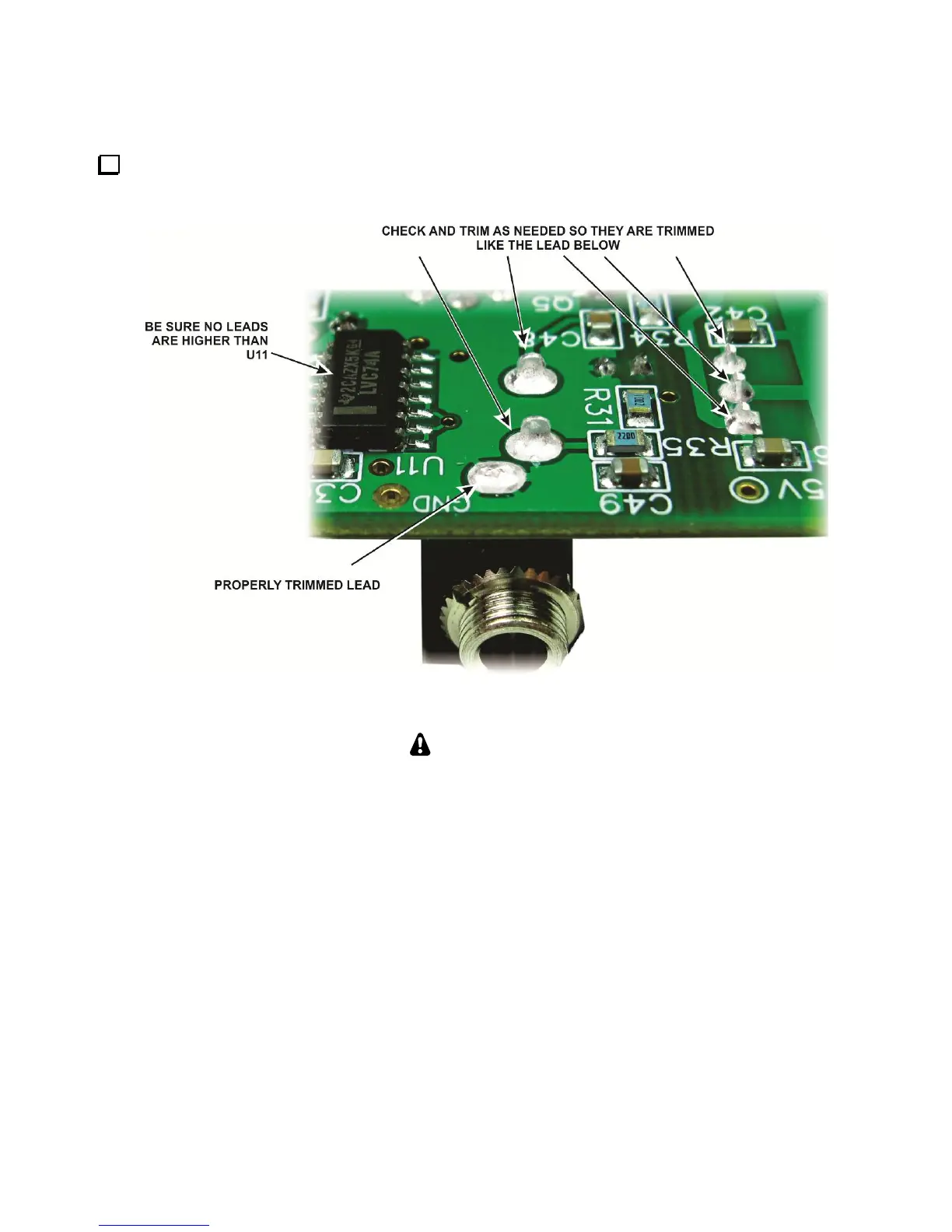 The objective of trimming any long leads is to be certain no bare leads touch the front