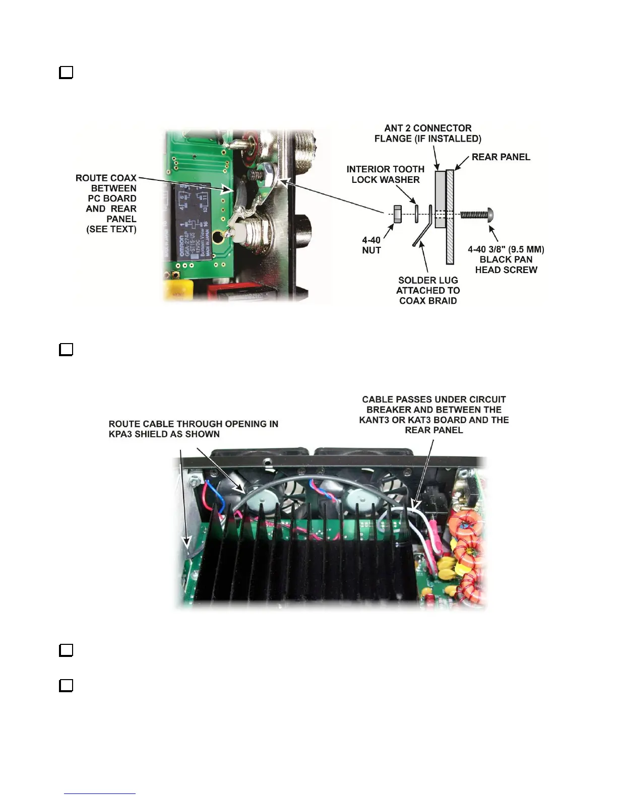 Thread the coaxial cable between the edge of the KANT3 or KAT3 board and the rear panel as shown. If