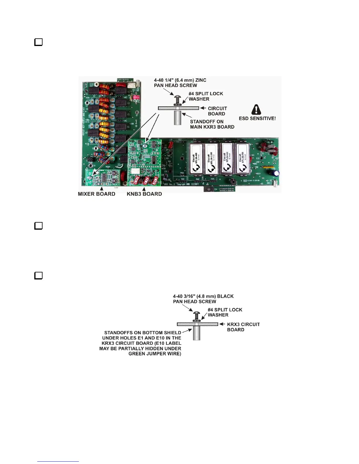 Secure the KRX3A main circuit board to the standoffs at E1 and E10 with 4-40 3/16” (4.8 mm) black pan