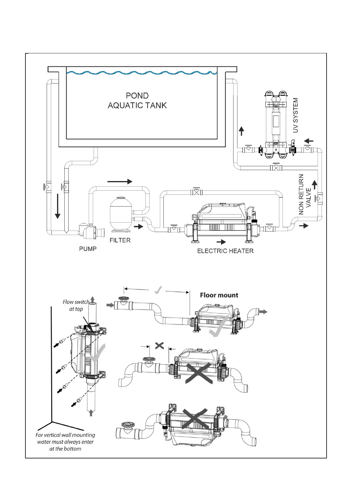 The heater should be installed at a low point in the filtration system. It should be positioned downstream