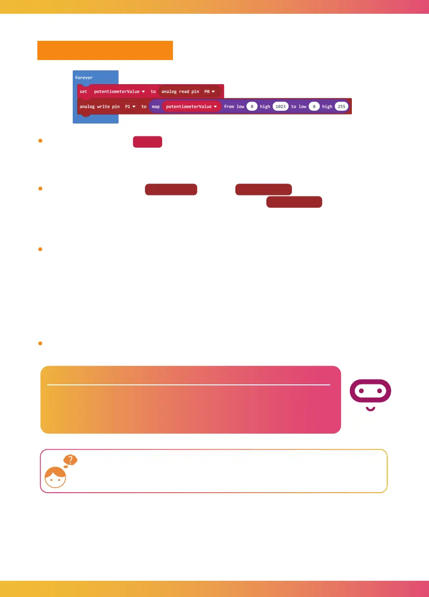 an analog value to a pin. In this case, we use this block to set the brightness of the LED, but
