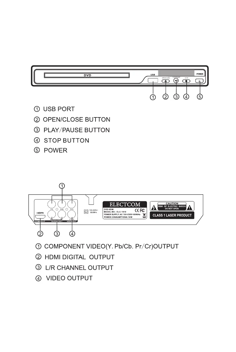 Electcom ELC-1910 - DVD Player Panel Overview; Front Panel Controls and Ports; Back Panel Connectivity Options