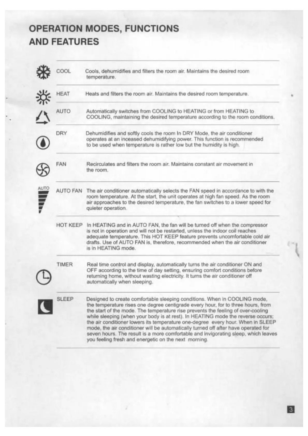 Electra COMPACT 9 - Operation Modes, Functions, and Features; COOL Mode; HEAT Mode; AUTO Mode