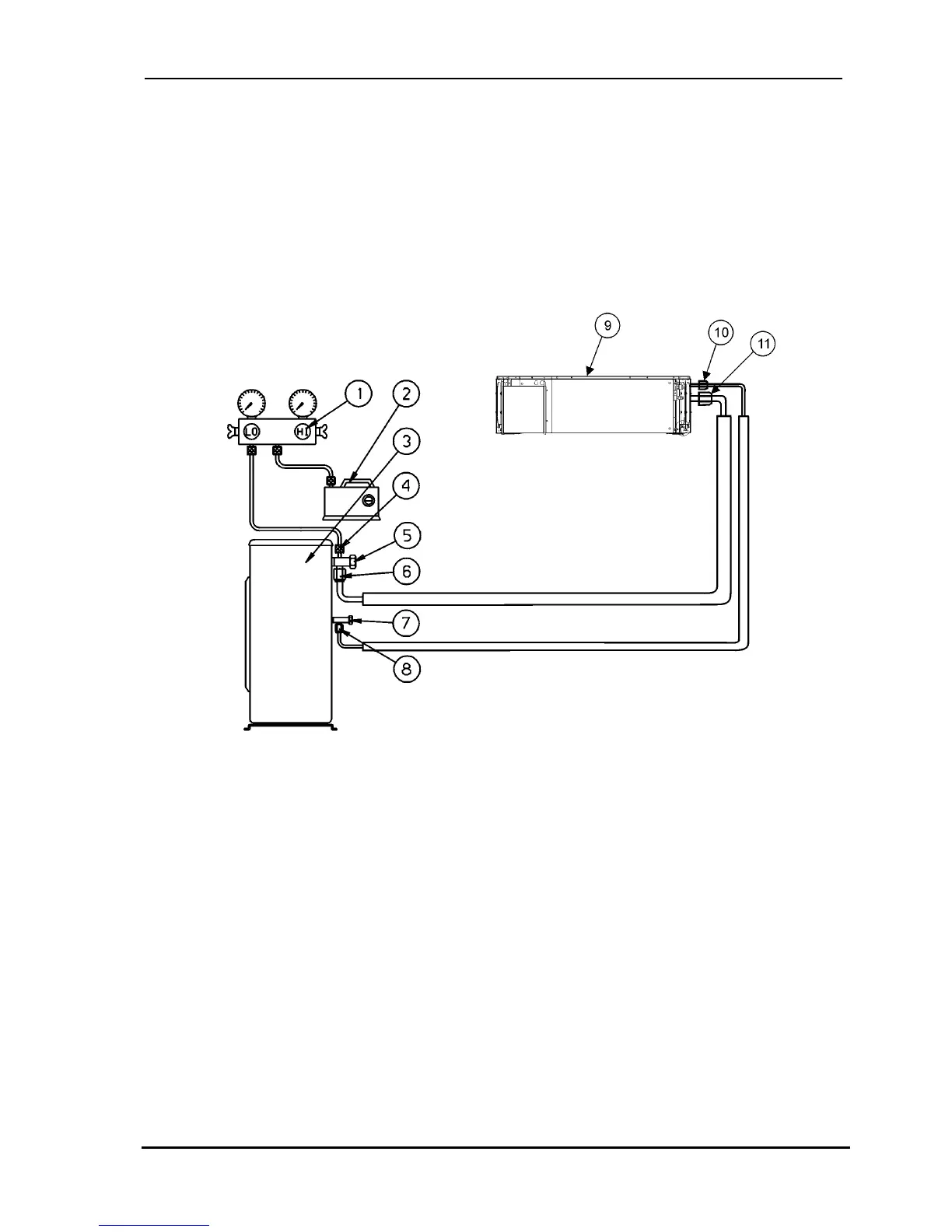 E. Close the two service taps of the manifold, on suction side and on the compression side,