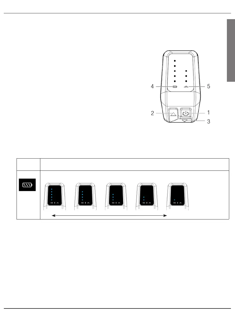 There are 5 LEDs located on the display unit which indicate the approximate level of charge of the battery pack.