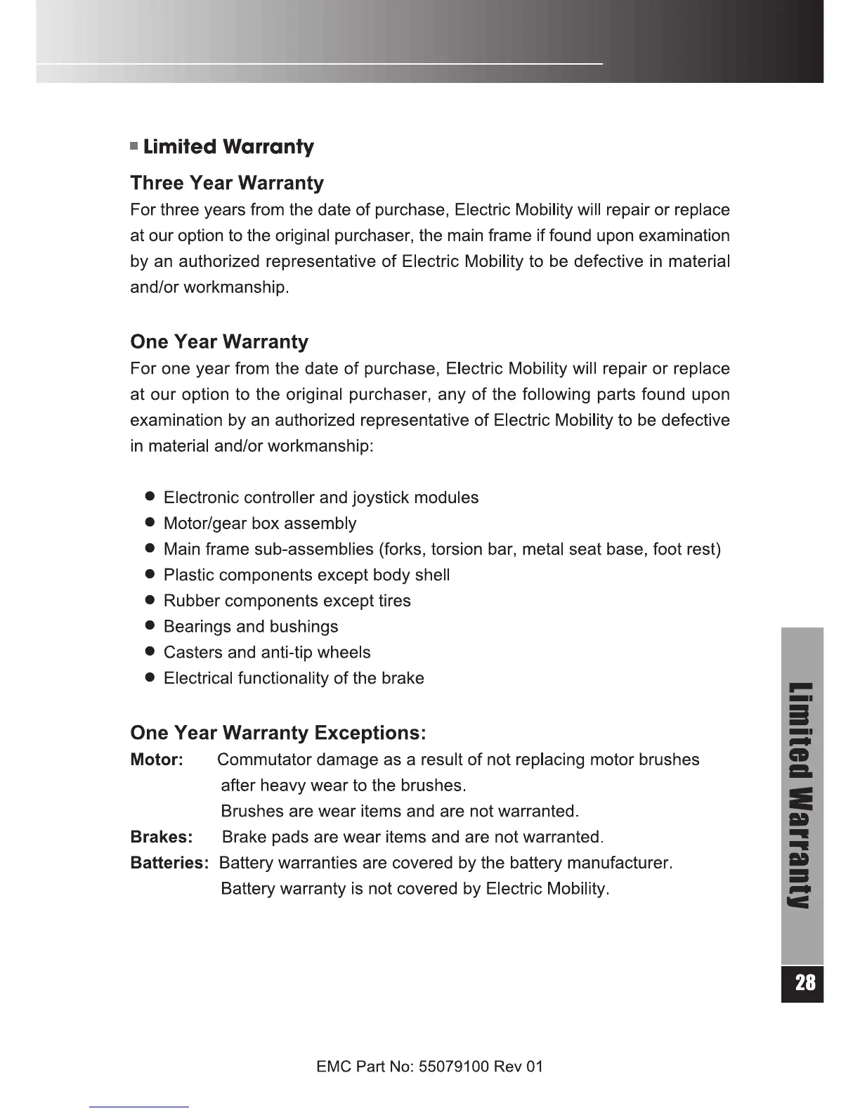 Electric Mobility Rascal 312 - Limited Warranty; Three-Year Main Frame Warranty; One-Year Component Warranty; Warranty Exceptions and Exclusions