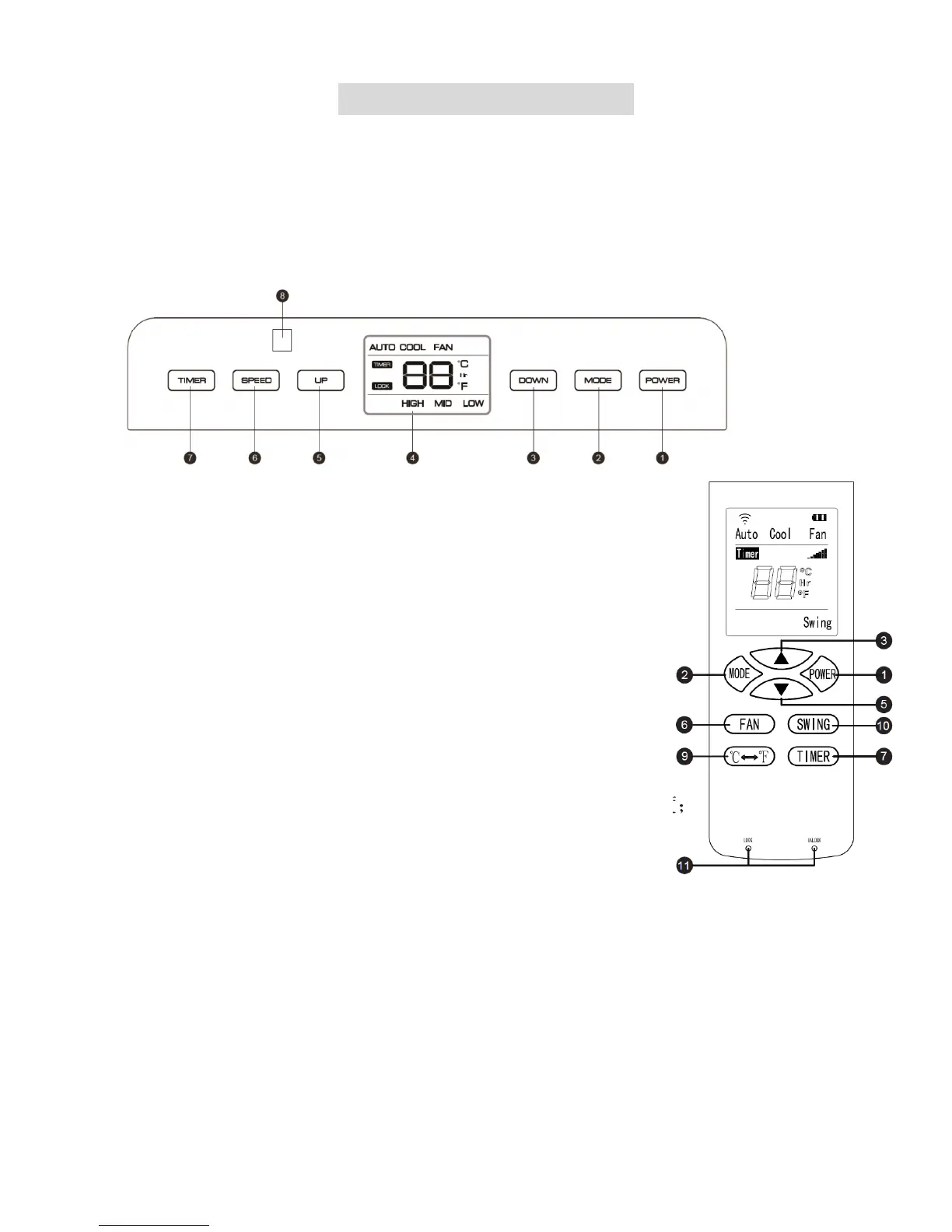 6. Fan speed key Press the key to choose high/ mid/low fan speed.