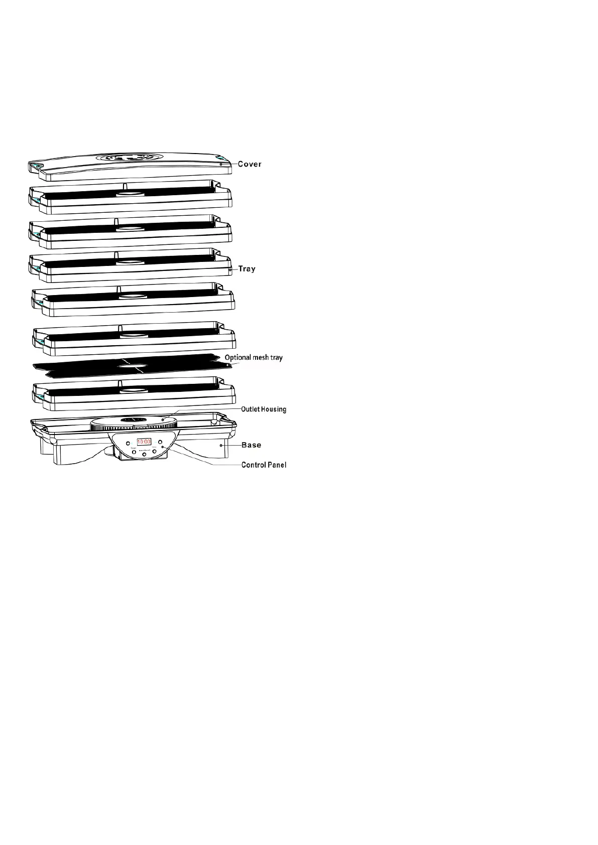 food will influence the length of the drying process. Use the special optional mesh and solid trays for liquid or