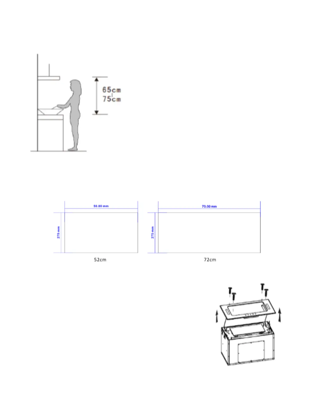 2. Drill a hole of 500*275(mm) for 52CM and 700*275(mm) for model 72CM in