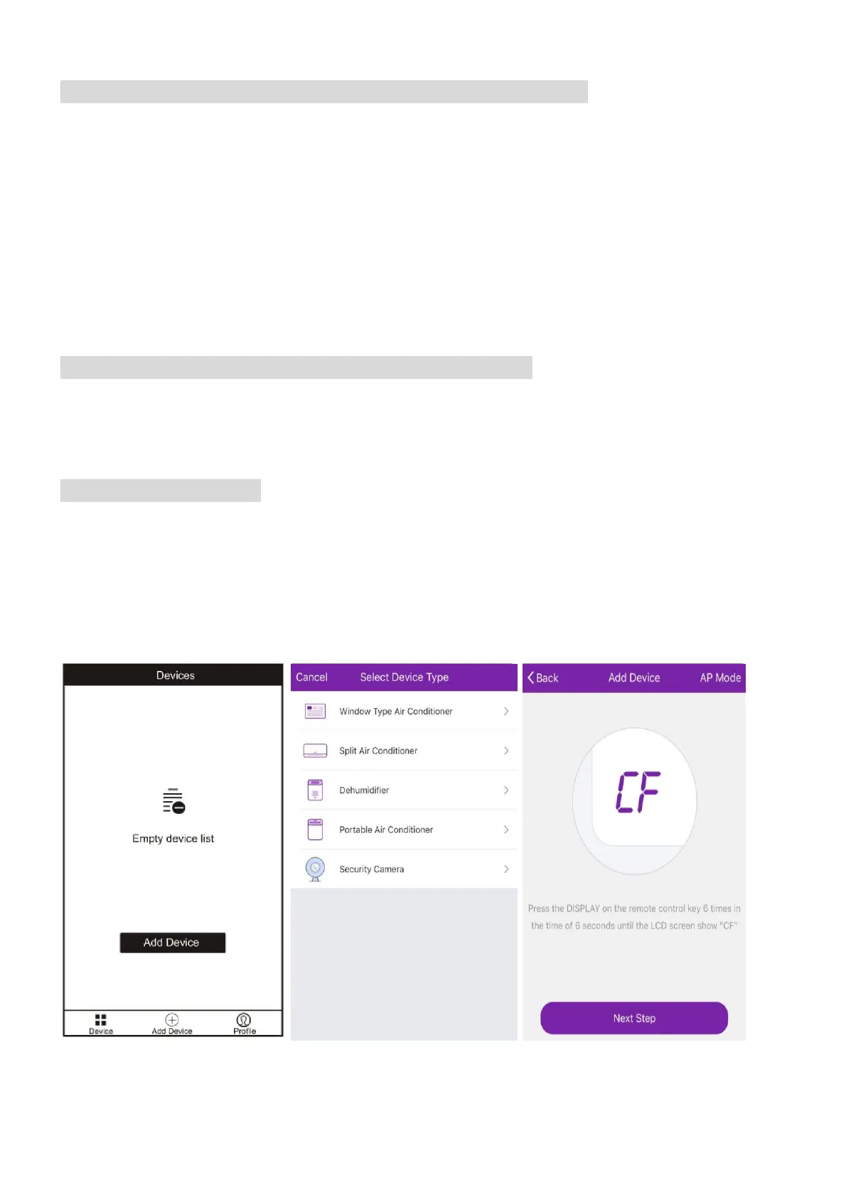 The air conditioner has two different setup modes, CF (Quick Connection) and AP (Access