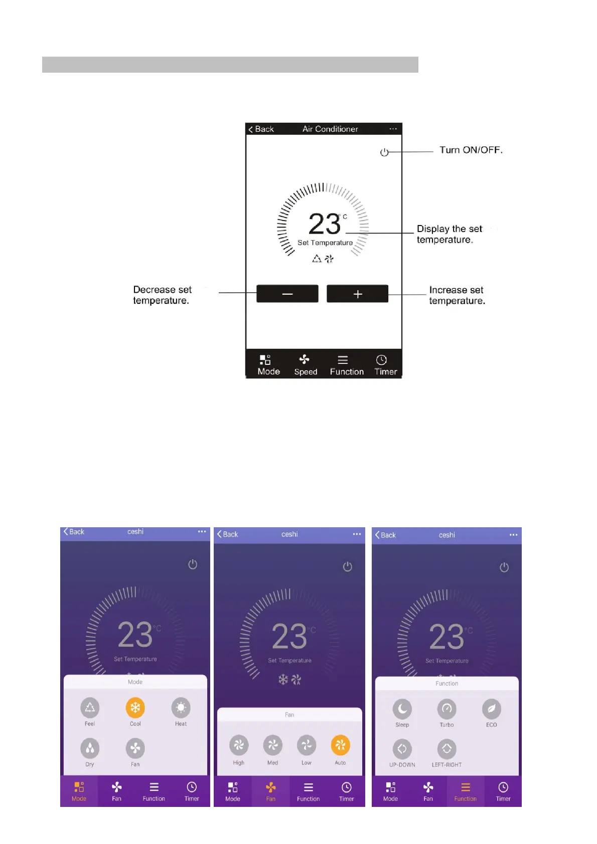 Mode: Allows the operating mode to be changed between Feel, Heat, Dry, Cool and Fan.