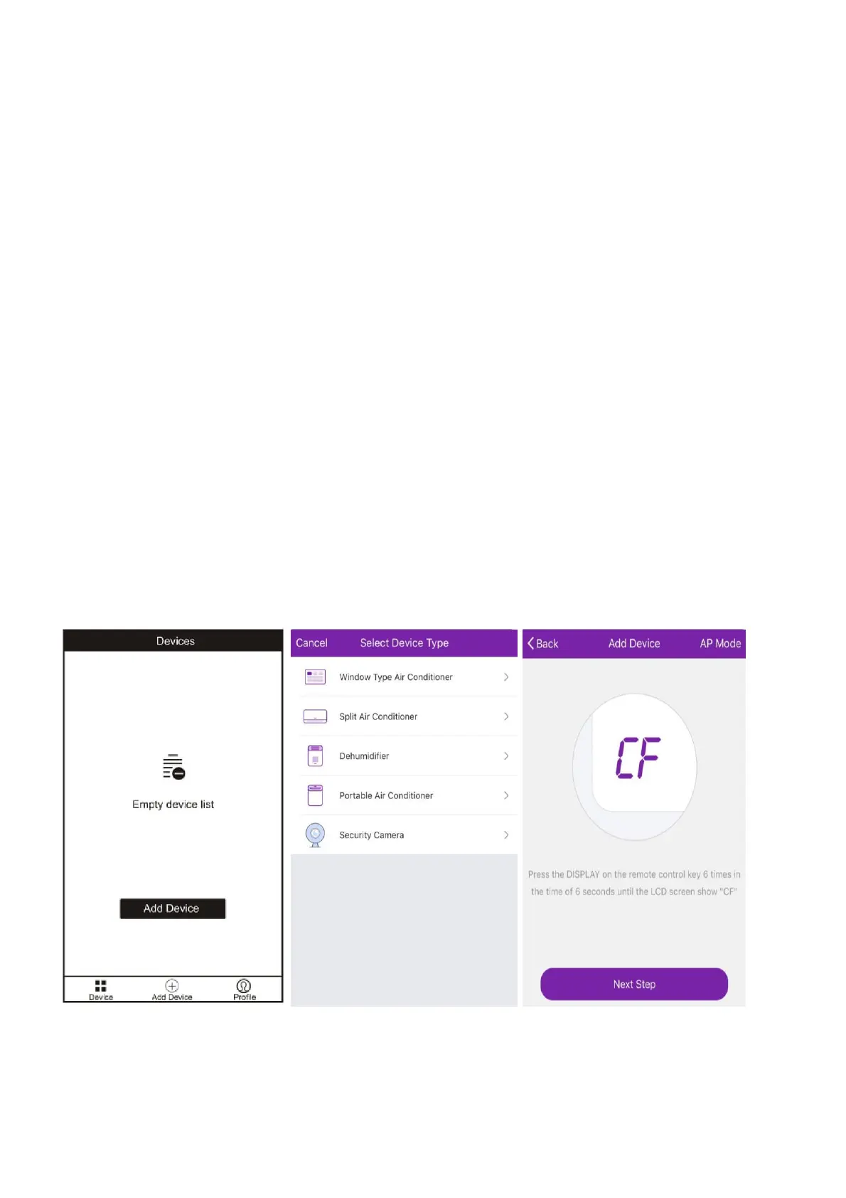 The air conditioner has two different setup modes, CF (Quick Connection) and AP (Access