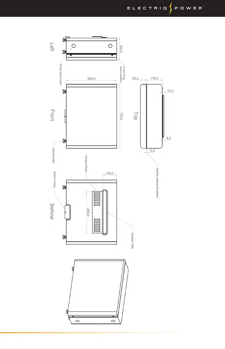 ElectrIQ PowerPod 2 - PowerPod 2 5 kWh Enclosure Dimensions; 5 kWh Enclosure Dimensions (Left, Top, Behind)