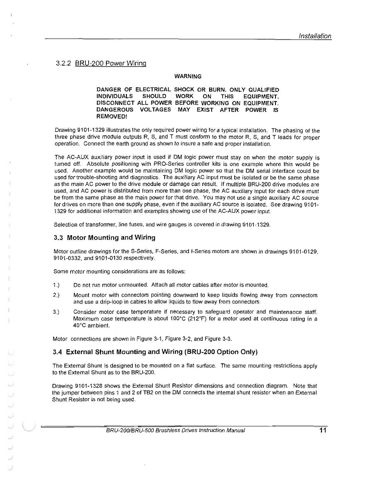 Electro-Craft BRU-500 - Power Wiring; Motor Mounting and Wiring; External Shunt Mounting and Wiring (BRU-200 DM-30 Option Only)