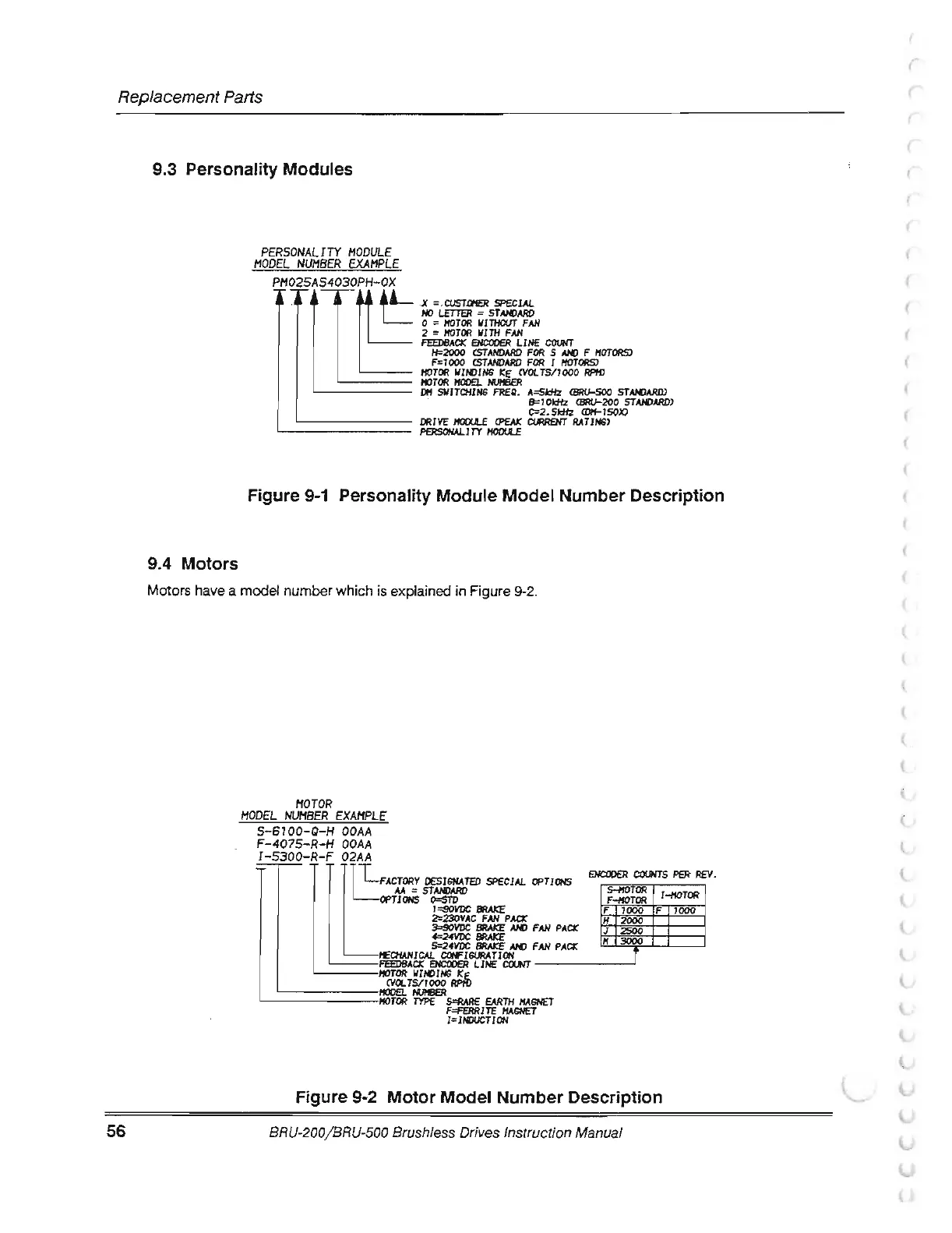 Electro-Craft BRU-500 - Figure 9-1 Personality Module Model Number Description; Figure 9-2 Motor Model Number Description; Motors; Personality Modules