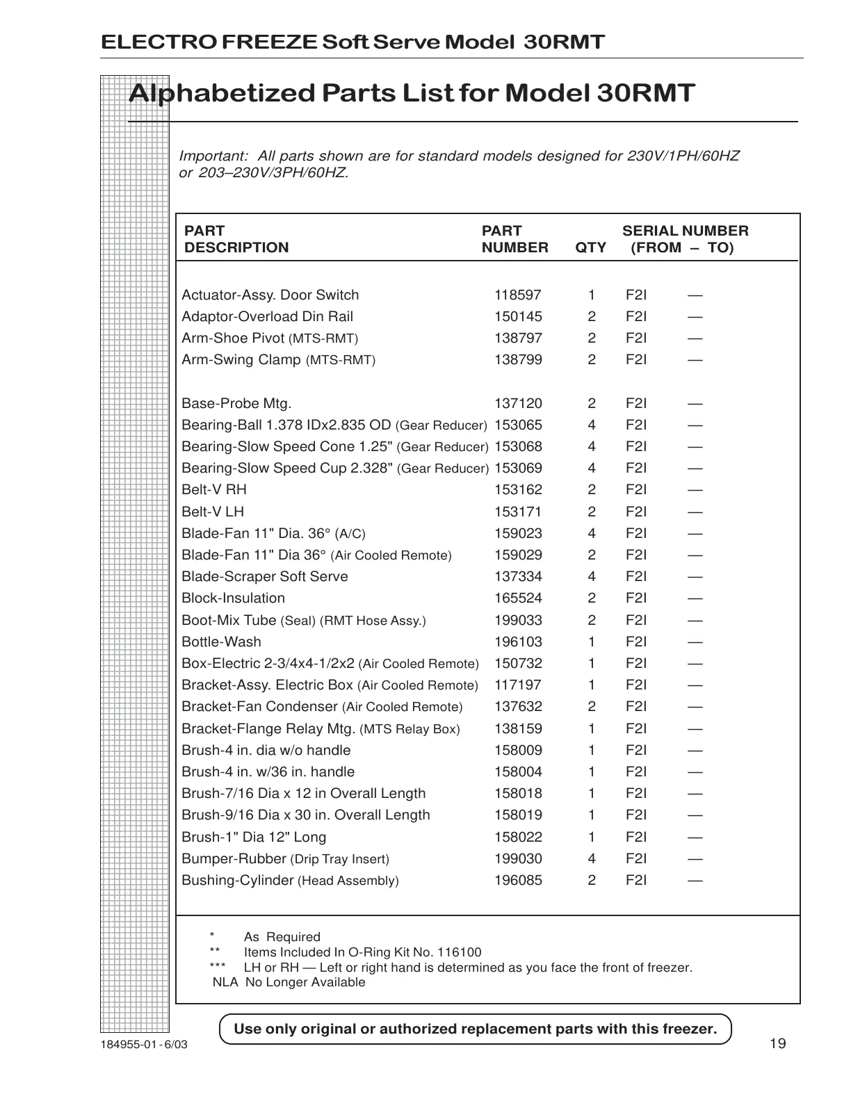 Alphabetized Parts List for Model 30RMT