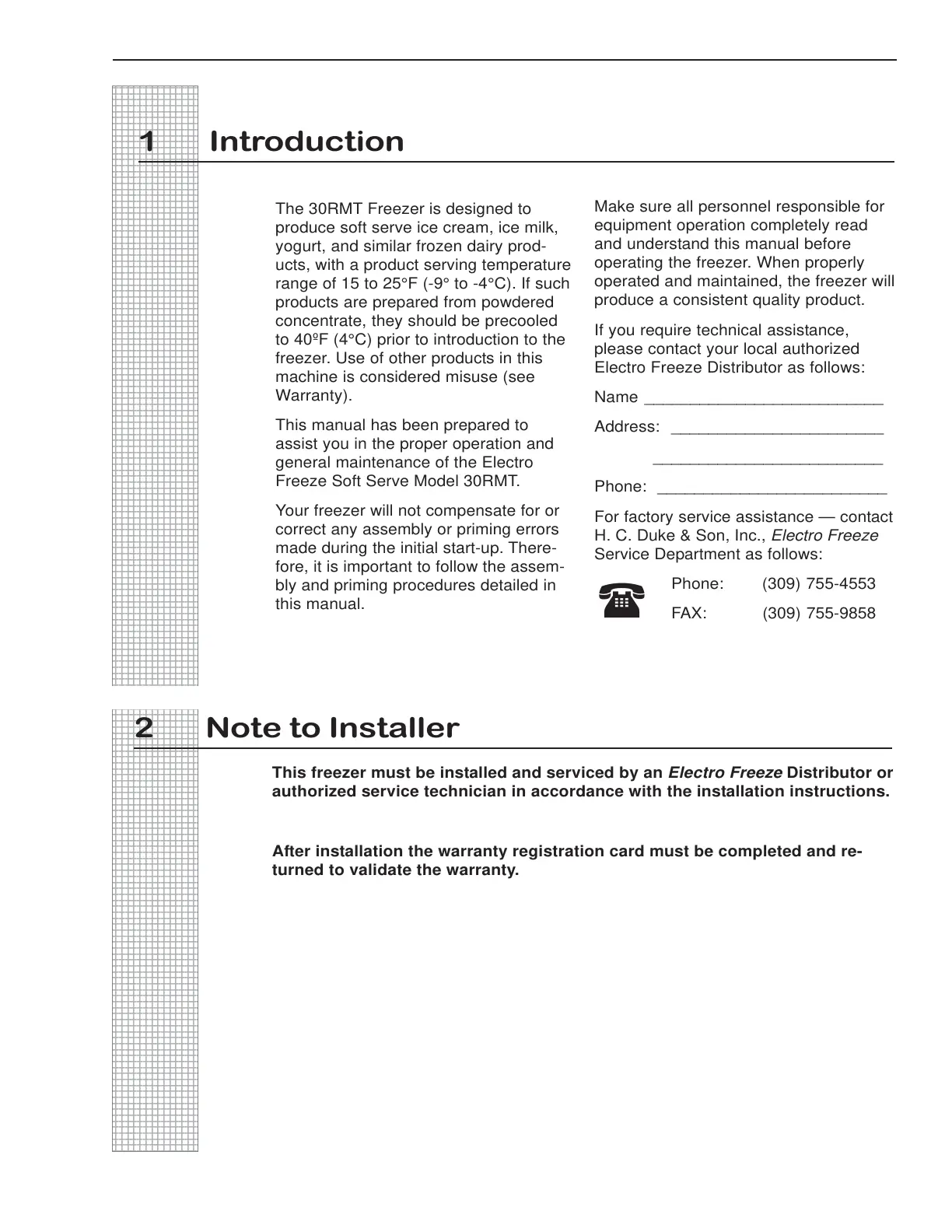 This freezer must be installed and serviced by an Electro Freeze Distributor or