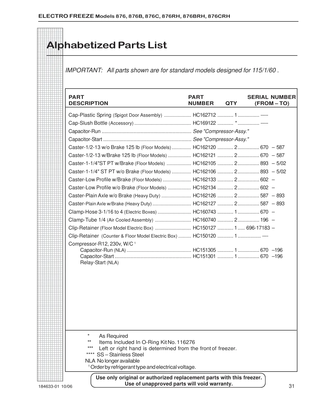 ELECTRO FREEZE Models 876, 876B, 876C, 876RH, 876BRH, 876CRH