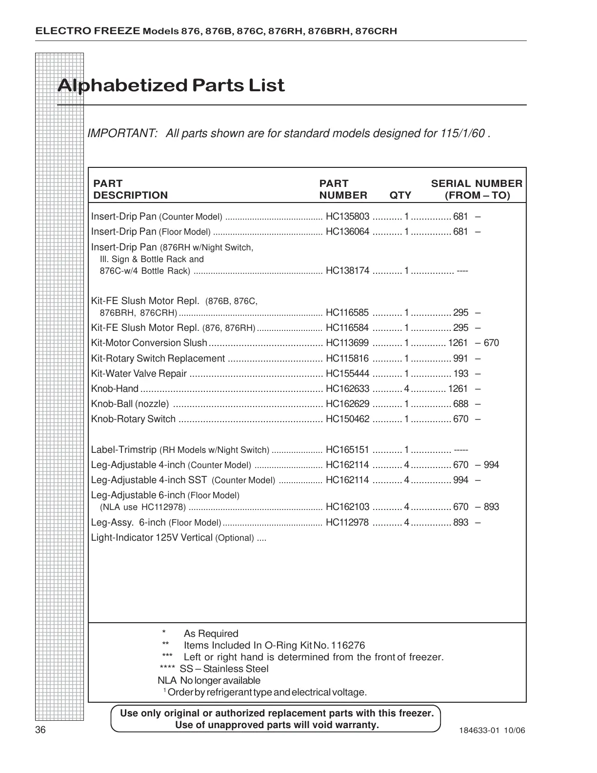 ELECTRO FREEZE Models 876, 876B, 876C, 876RH, 876BRH, 876CRH