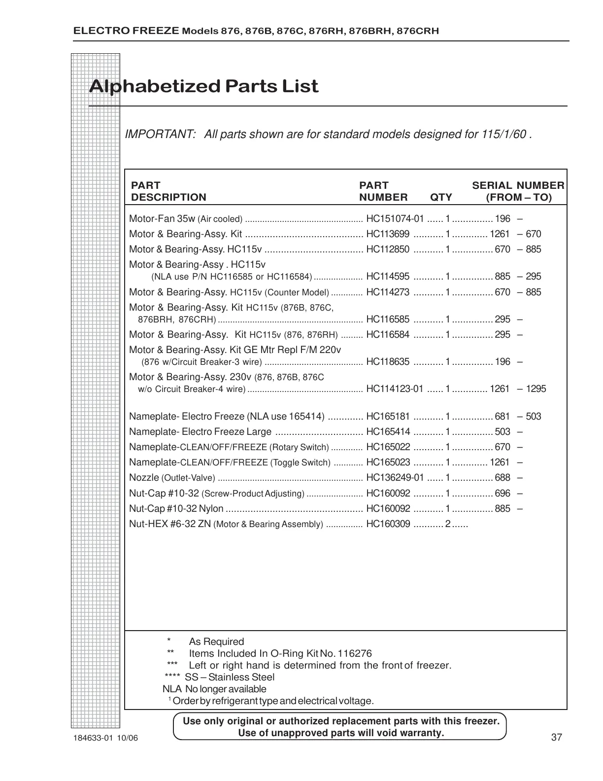 ELECTRO FREEZE Models 876, 876B, 876C, 876RH, 876BRH, 876CRH