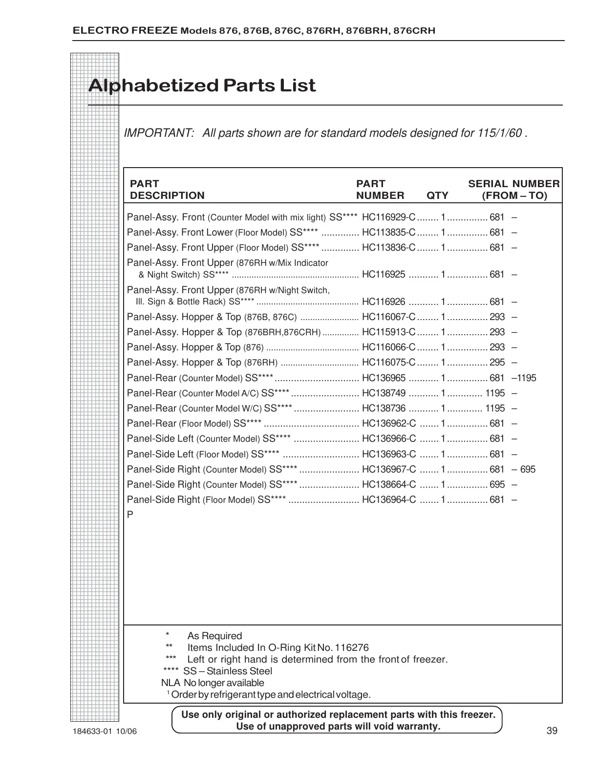 Panel-Assy. Front Lower (Floor Model) SS**** .............. HC113835-C........ 1............... 681 –