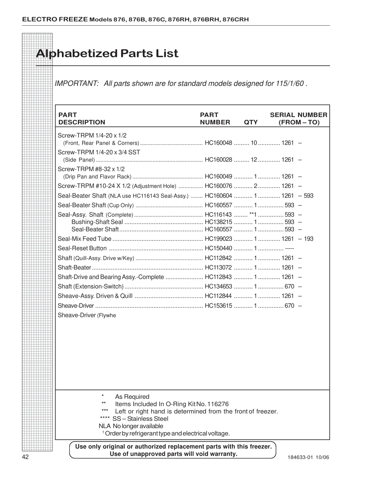 ELECTRO FREEZE Models 876, 876B, 876C, 876RH, 876BRH, 876CRH