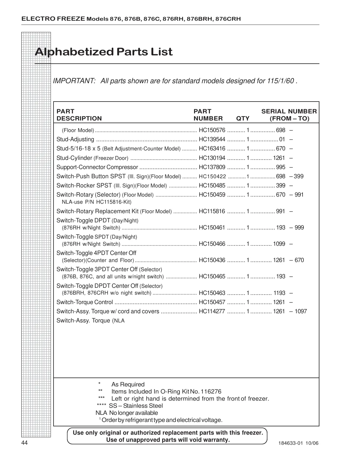 Switch-Rotary Replacement Kit (Floor Model) ................ HC115816 ........... 1...............991 –