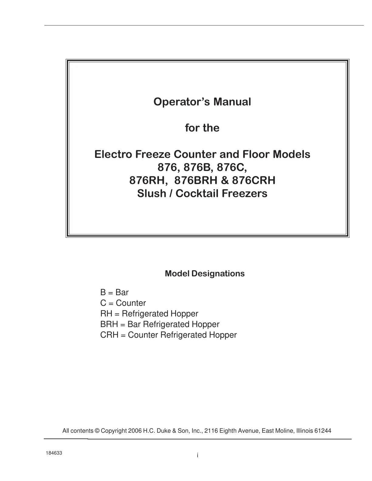 ELECTRO FREEZE Models 876, 876B, 876C, 876RH, 876BRH, 876CRH