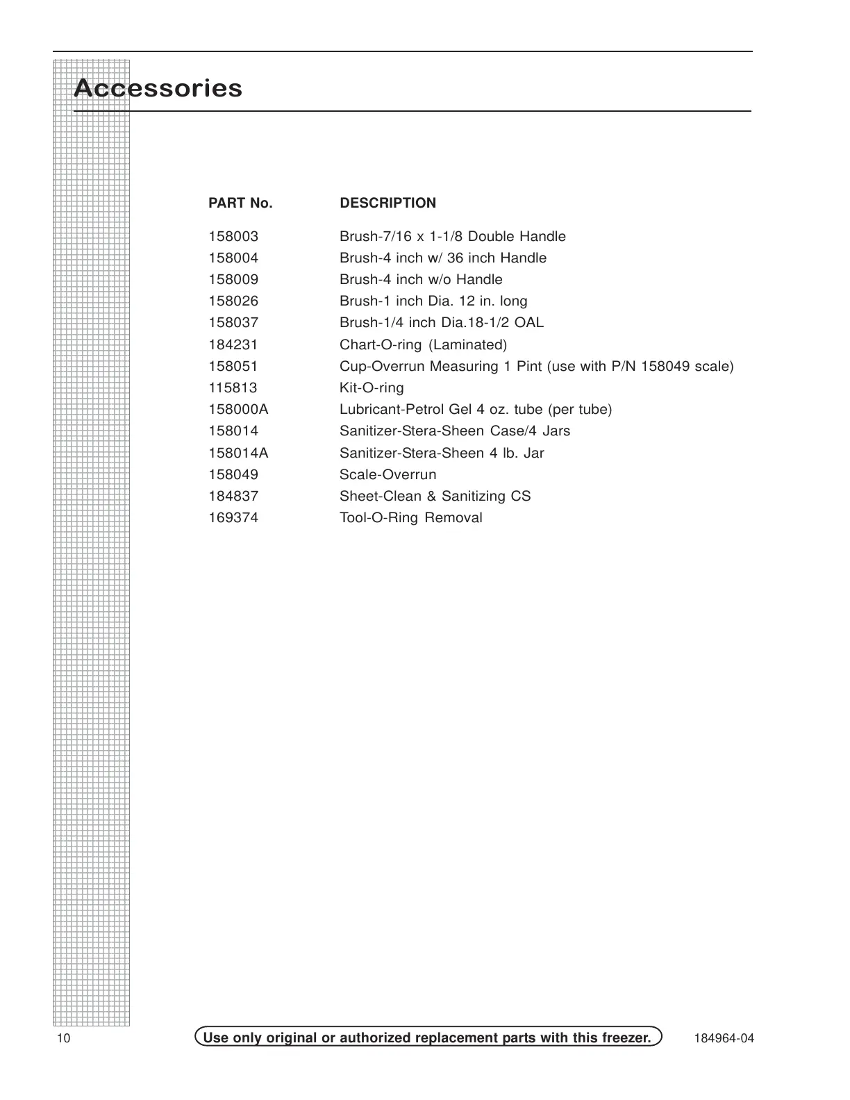 10 Use only original or authorized replacement parts with this freezer. 184964-04