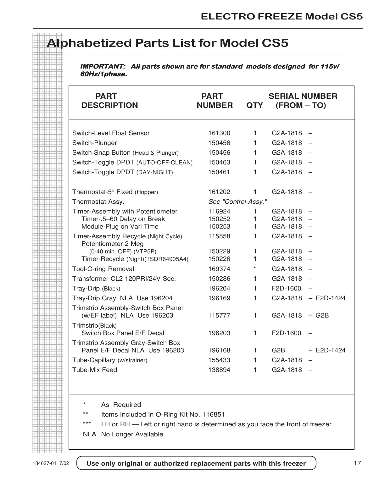 IMPORTANT: All parts shown are for standard models designed for 115v/